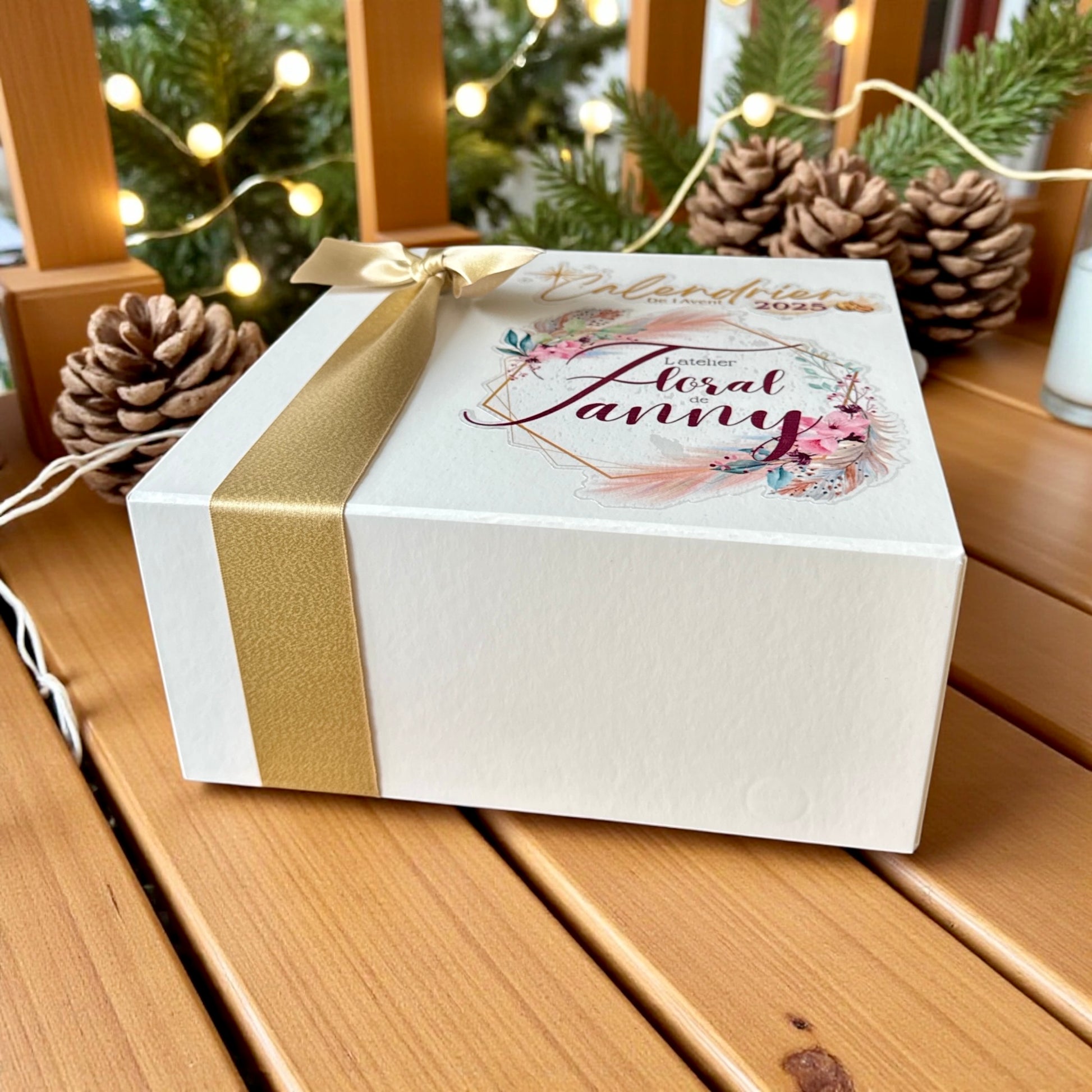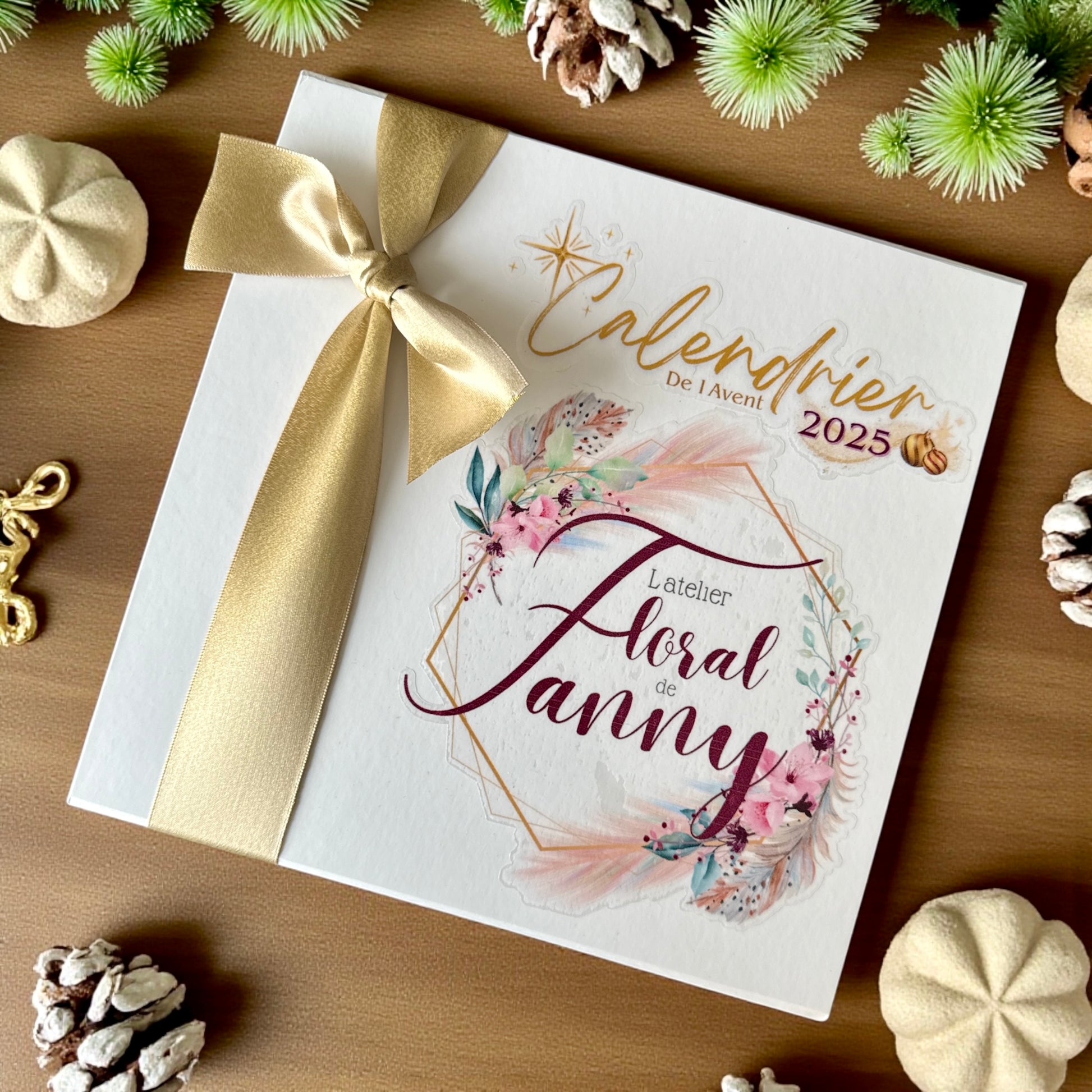 Présenté dans une élégante boîte blanche aimantée, ornée d’un ruban doré et du logo de l’Atelier Floral de Fanny, ce calendrier de l’Avent 2025 renferme 24 sachets kraft, chacun abritant une création artisanale unique.