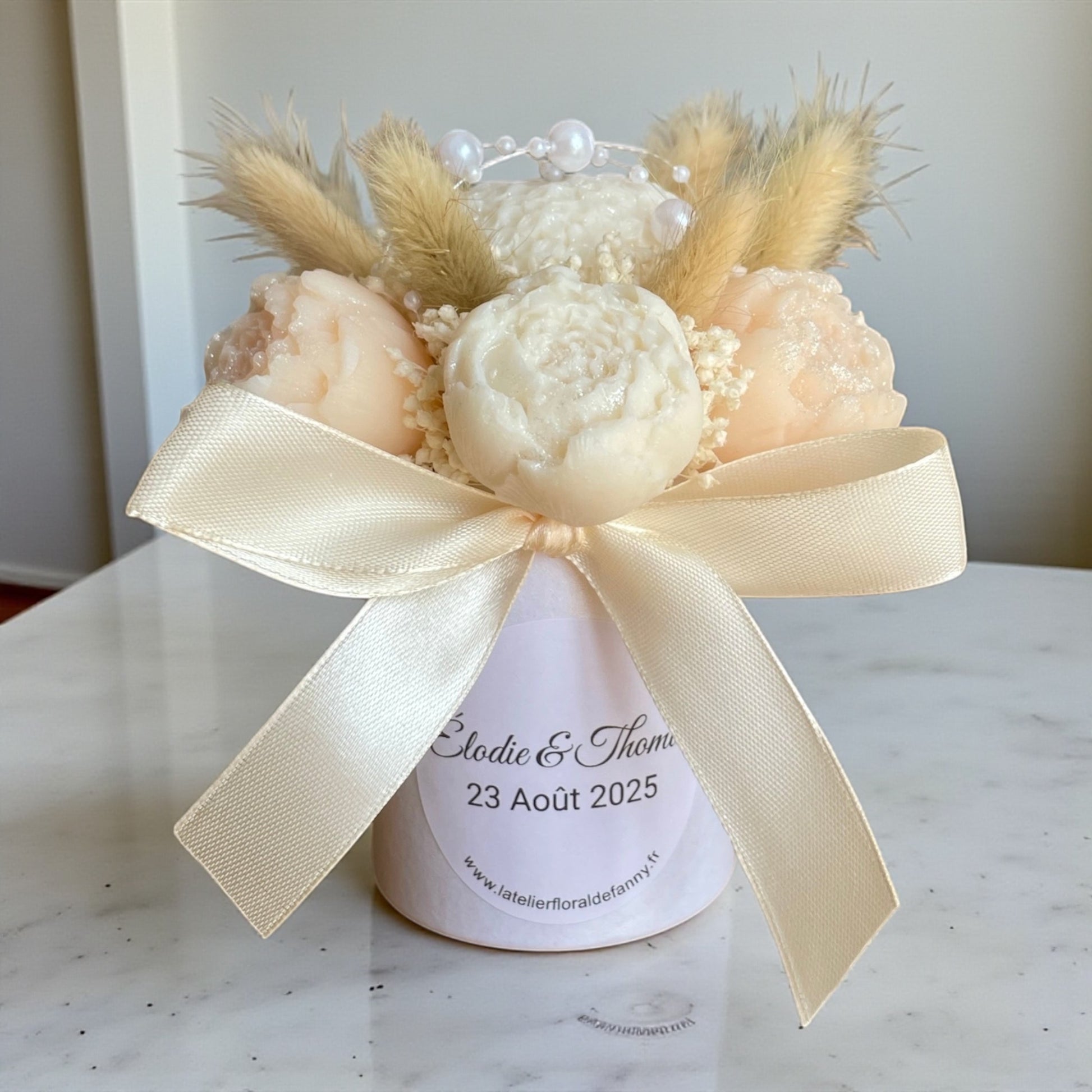 Il se compose de six pivoines en cire végétale et d’un cœur central, dans une palette apaisante de blanc et blanc crème. Chaque détail a été pensé pour évoquer la tendresse, l’harmonie et la fraîcheur d’un jour précieux.